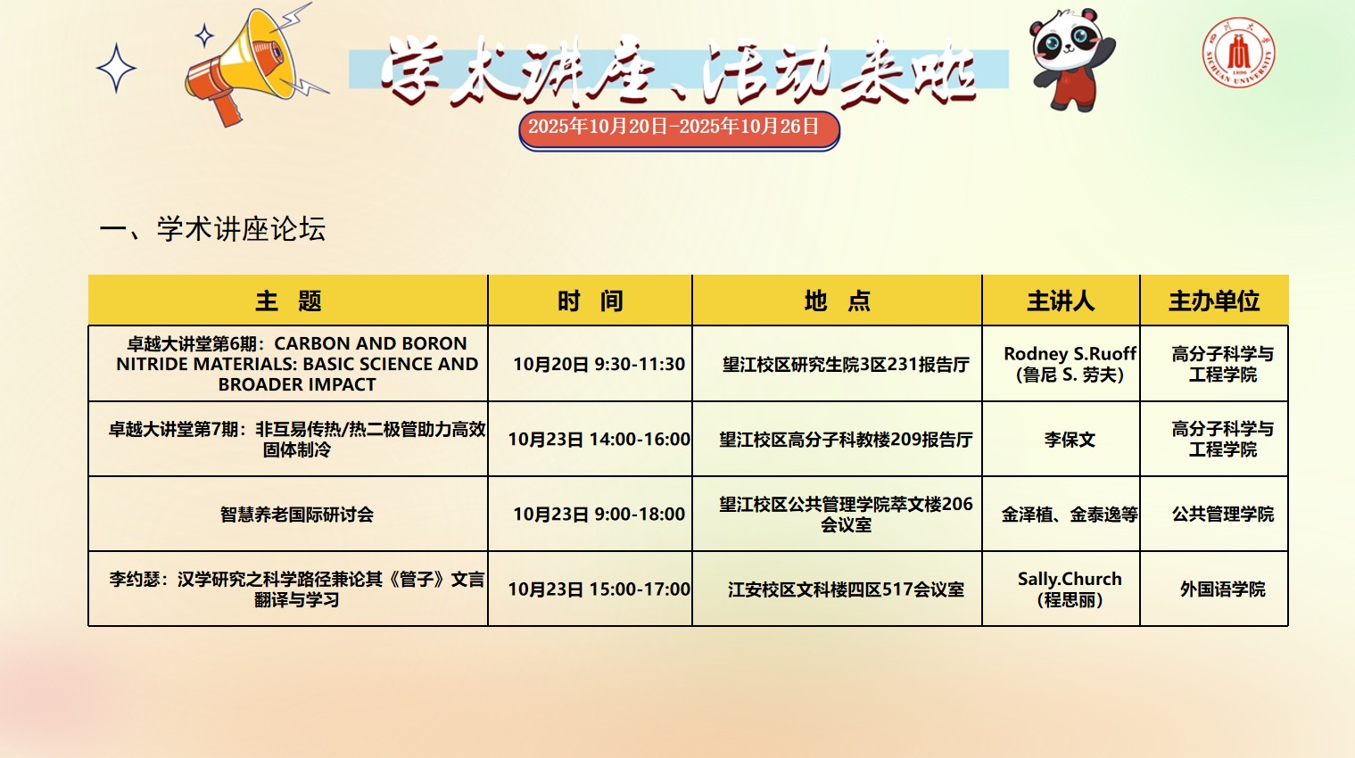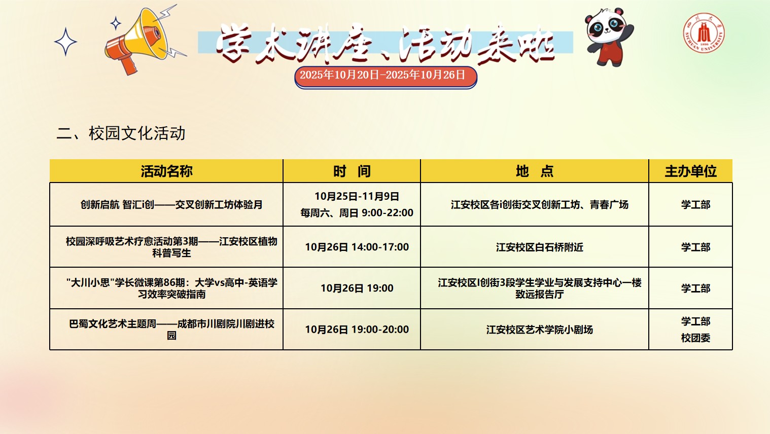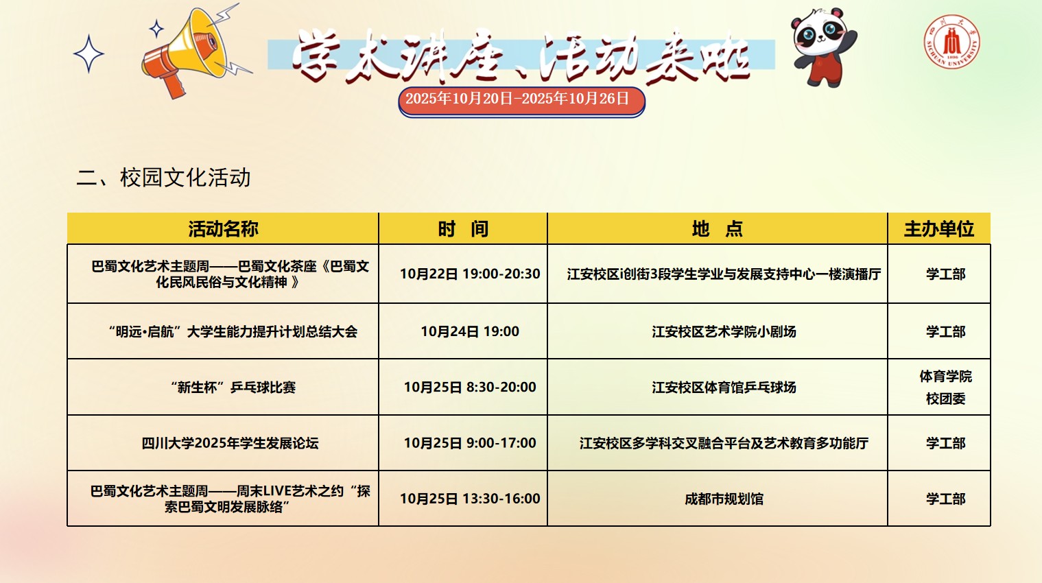 四川大学2025年10月20日-2025年10月26日校园文化活动预告