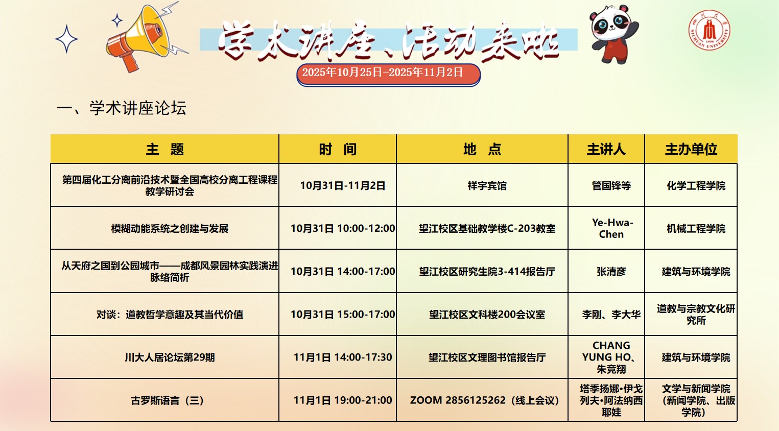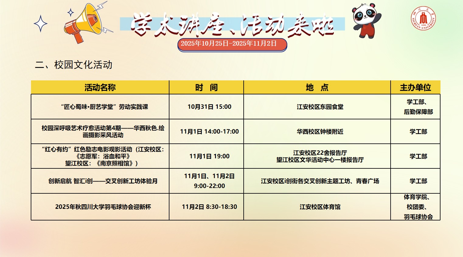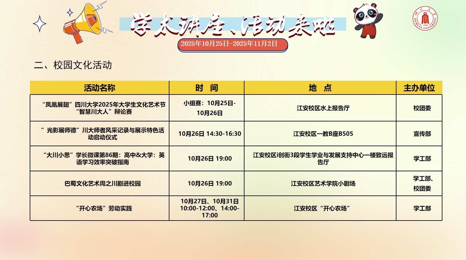 四川大学2025年10月25日-2025年11月2日校园文化活动预告