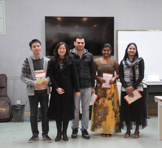 联欢会最后,熊院长为游戏获胜的同学颁发纪念品,参会同学合影留念。据了解,晚会结束,留学生们都久久不愿离去,本来时间充裕的晚会在他们看来却显得短促,他们渴望晚会时间更长,这样与老师们、中国同学们的交流时间就更多。晚会使同学们在繁忙的期末得到放松,留学生与中国学生也有了更近距离交流的机会,帮助留学生更好地适应在中国的生活、获得归属感。