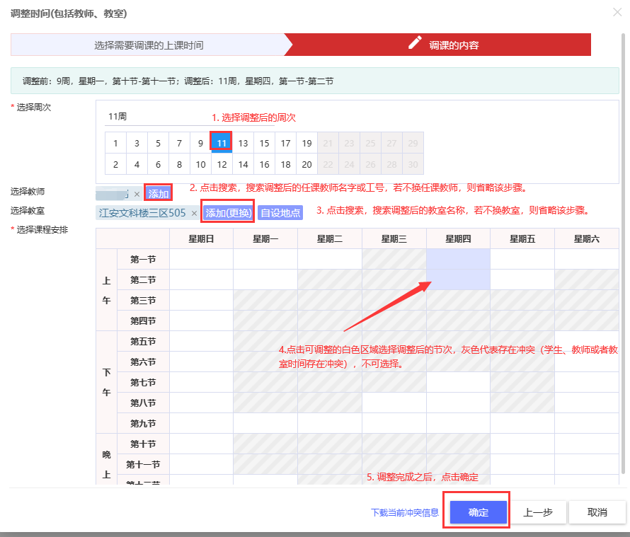 选择需要调课的上课时间-点击单元格选择需要调整的周次-选择对应周次的对应节次-下一步