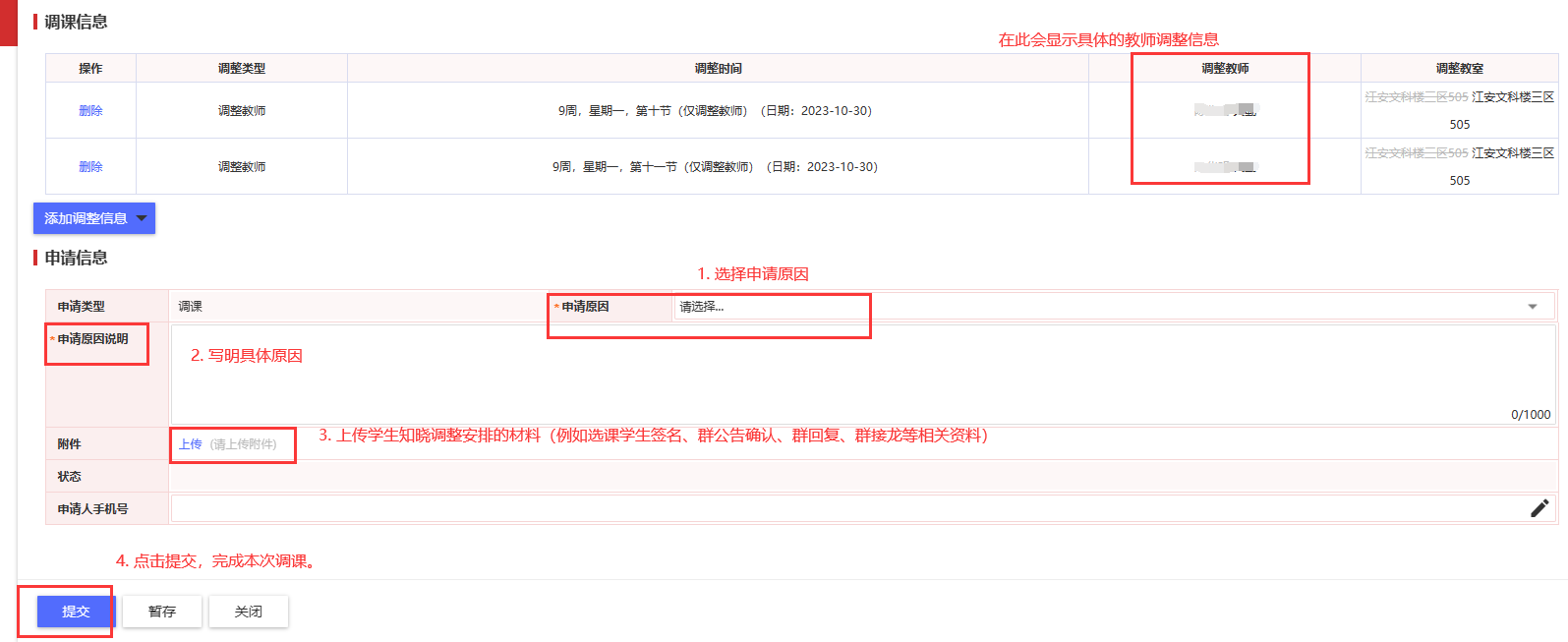 调课的内容-选择教师-点击添加-搜索调整后任课教师名字或工号-添加-点击确定